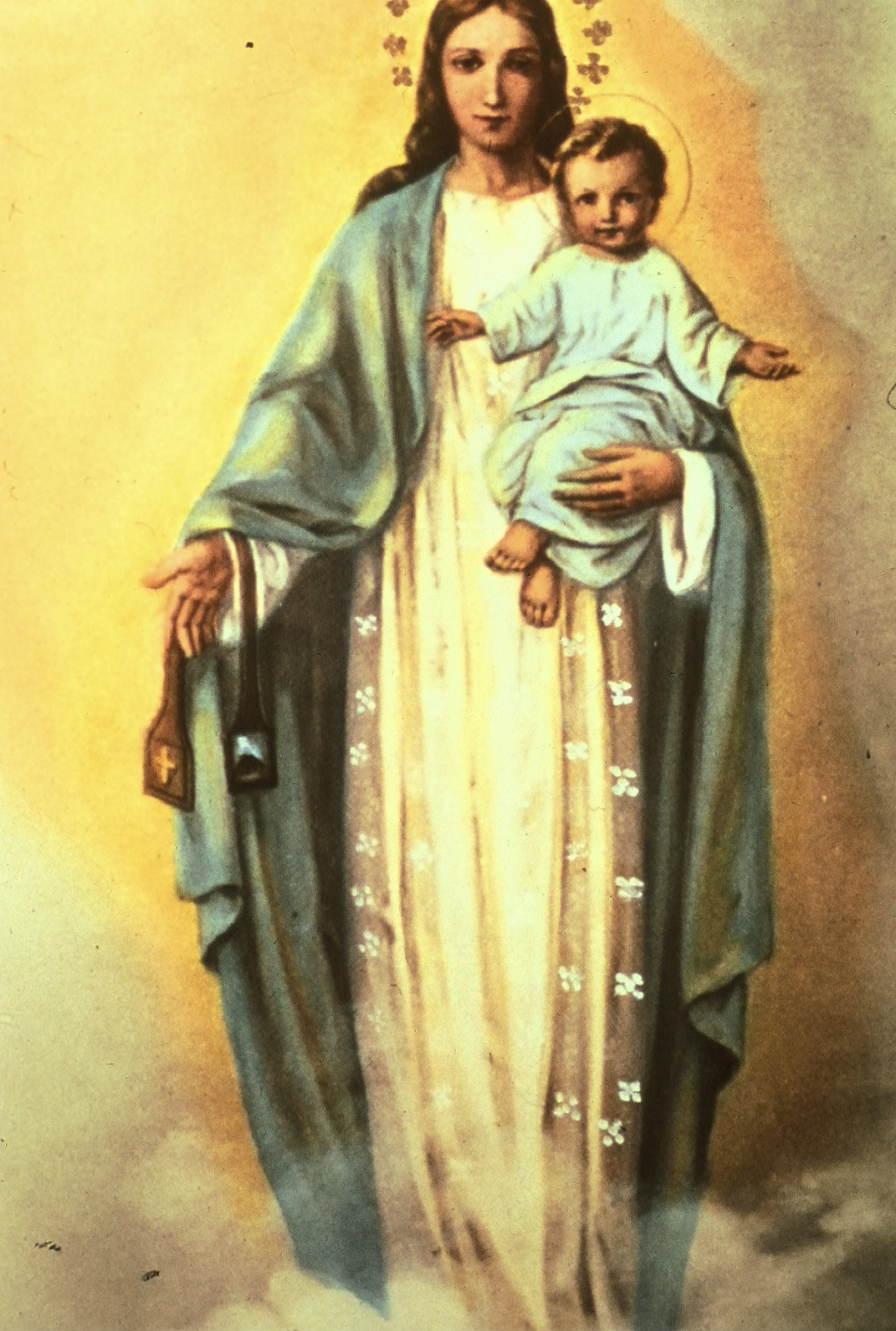 were not visible and on her right wrist hung a scapular. Around her head was a crown of golden stars.